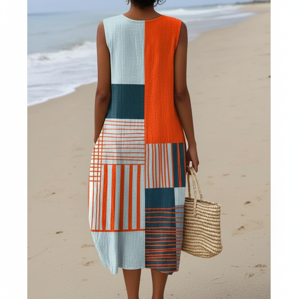 Luce un estilo único con este ligero vestido midi de silueta relajada y un atrevido estampado geométrico en bloques de color naranja, azul y blanco. Perfecto para un brunch, días de playa o noches informales, combina comodidad natural con un estilo moderno que te encantará usar una y otra vez.